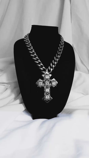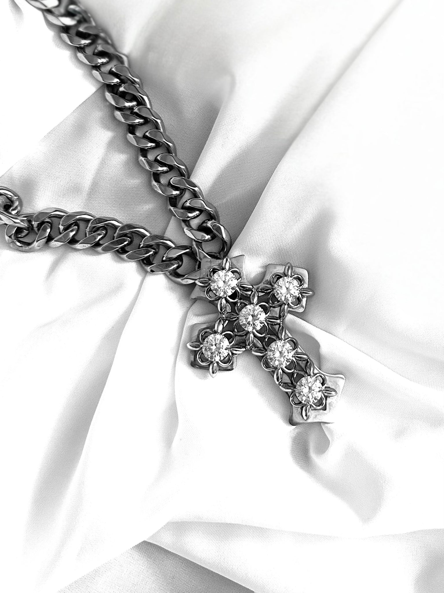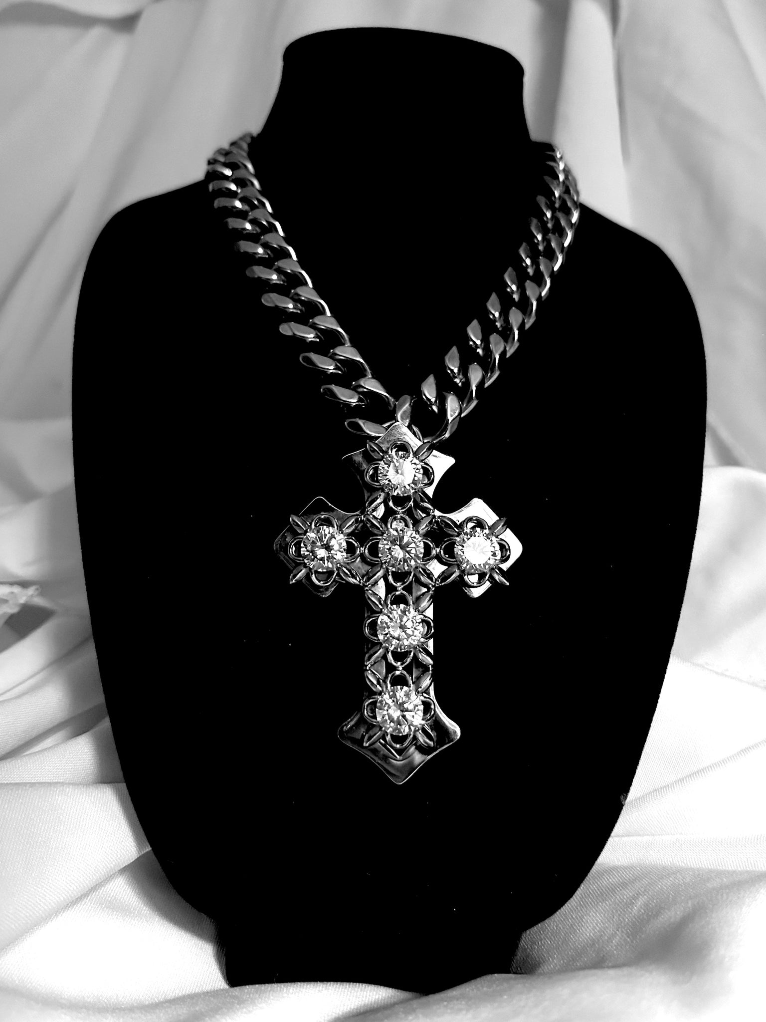 Own the moment in The Stelar Cross Chain. This luxury piece combines a classic, weighty curb chain crafted from ultra-smooth high-polish stainless steel with a stunningly detailed cross pendant. The five-point floral setting of the sparkling CZ stones creates an extraordinary diamond-like gleam. The result is a substantial, striking necklace that delivers maximum luminosity and a truly premium feel.